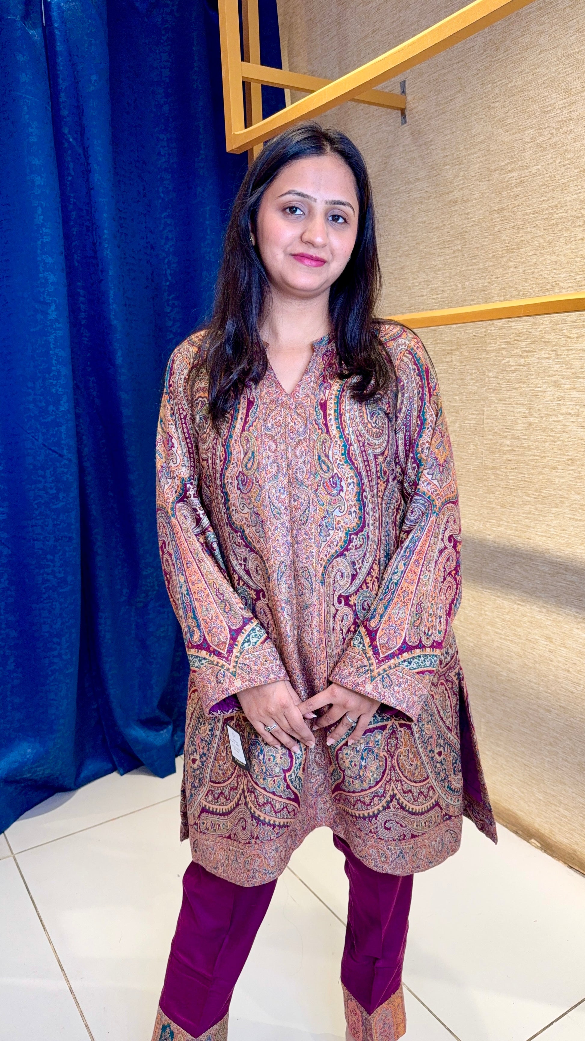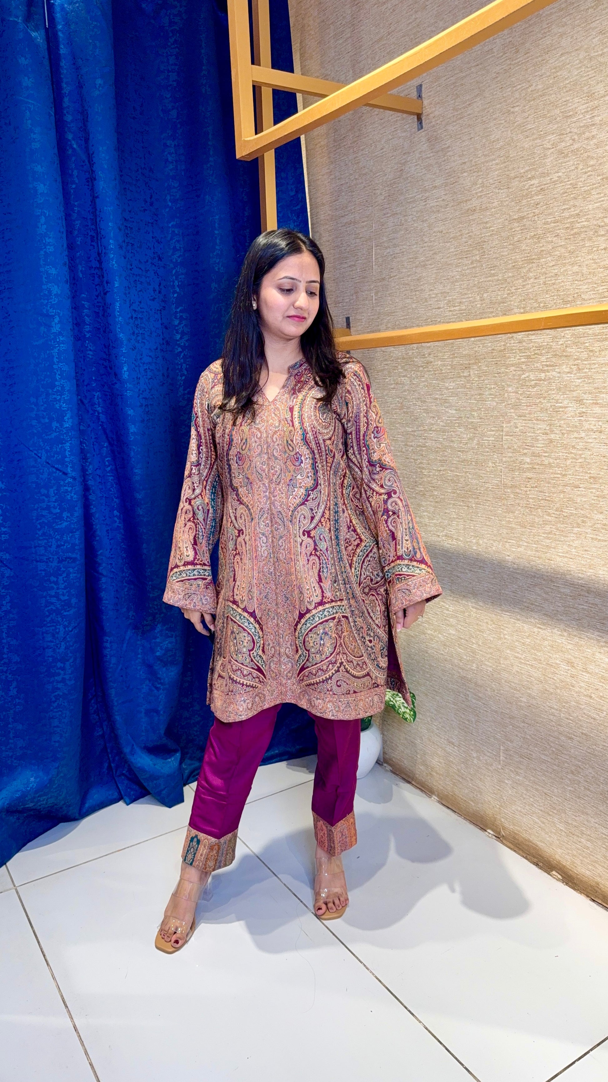 Celebrate timeless ethnic charm with this beautifully printed coord set, featuring intricate paisley motifs in warm, rich tones. The straight-fit kurta is paired with contrast pants detailed with coordinated borders, creating a balanced and refined look.